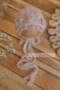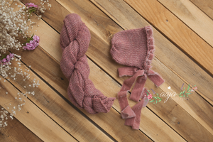 Baby newborn bonnet and knitted wrap set, pale rose pink, Velvet ties, made to order