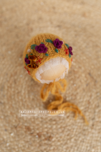 Baby newborn bonnet embroidered, mustard yellow, flowers, RTS