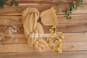 Baby newborn bonnet and knitted wrap set, yellow, butter, Velvet ties, made to order