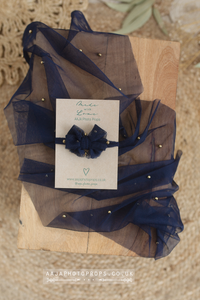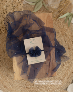 Baby newborn pearl beaded layer and bow tieback, dark blue, RTS