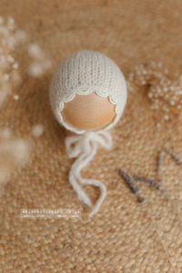 Knitted Baby newborn bonnet, Ivory/off white beaded edge, RTS