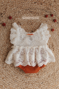 Newborn baby girl romper, vintage, burnt orange, cream, boho, frilly, lace, made to order