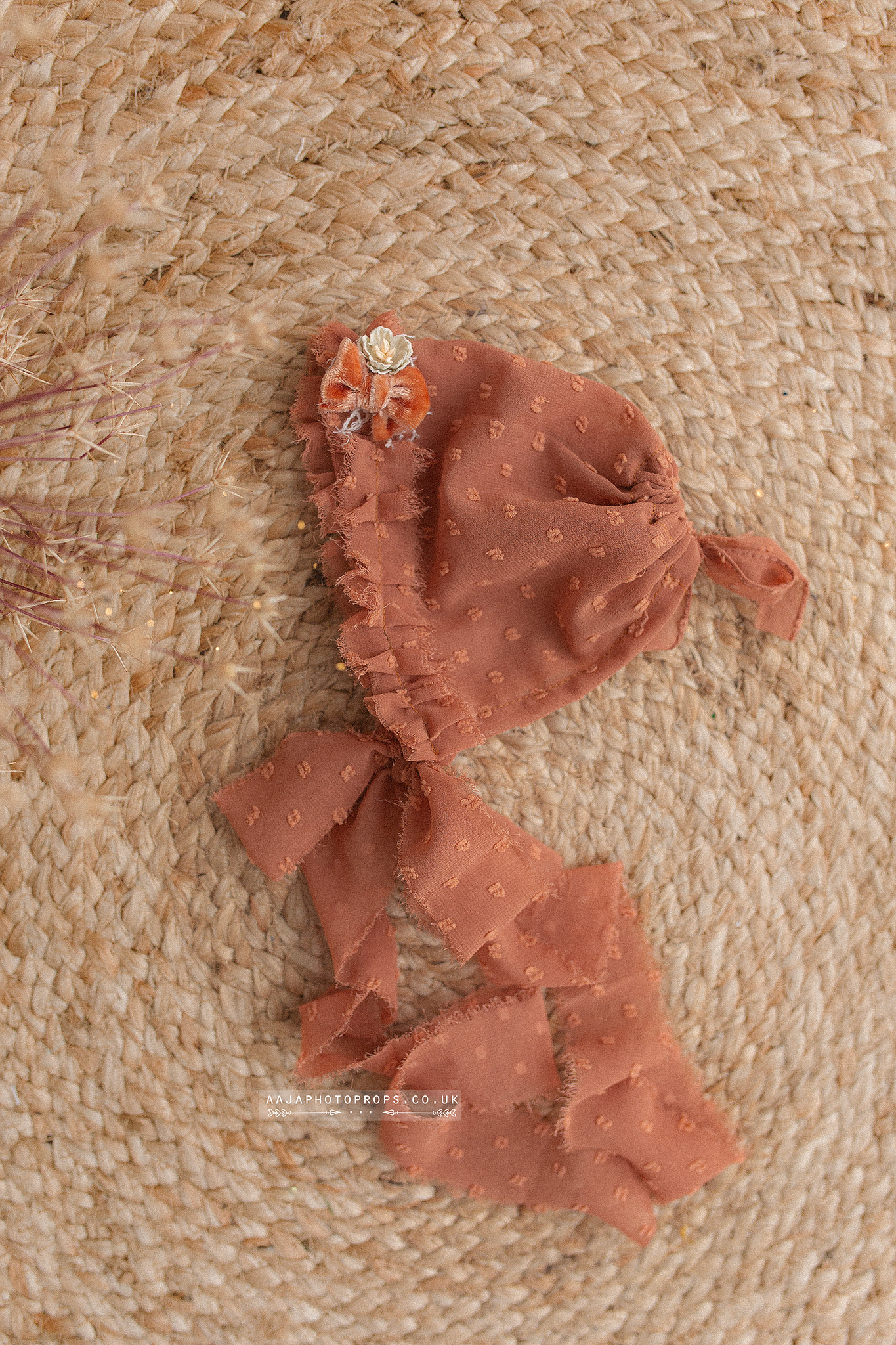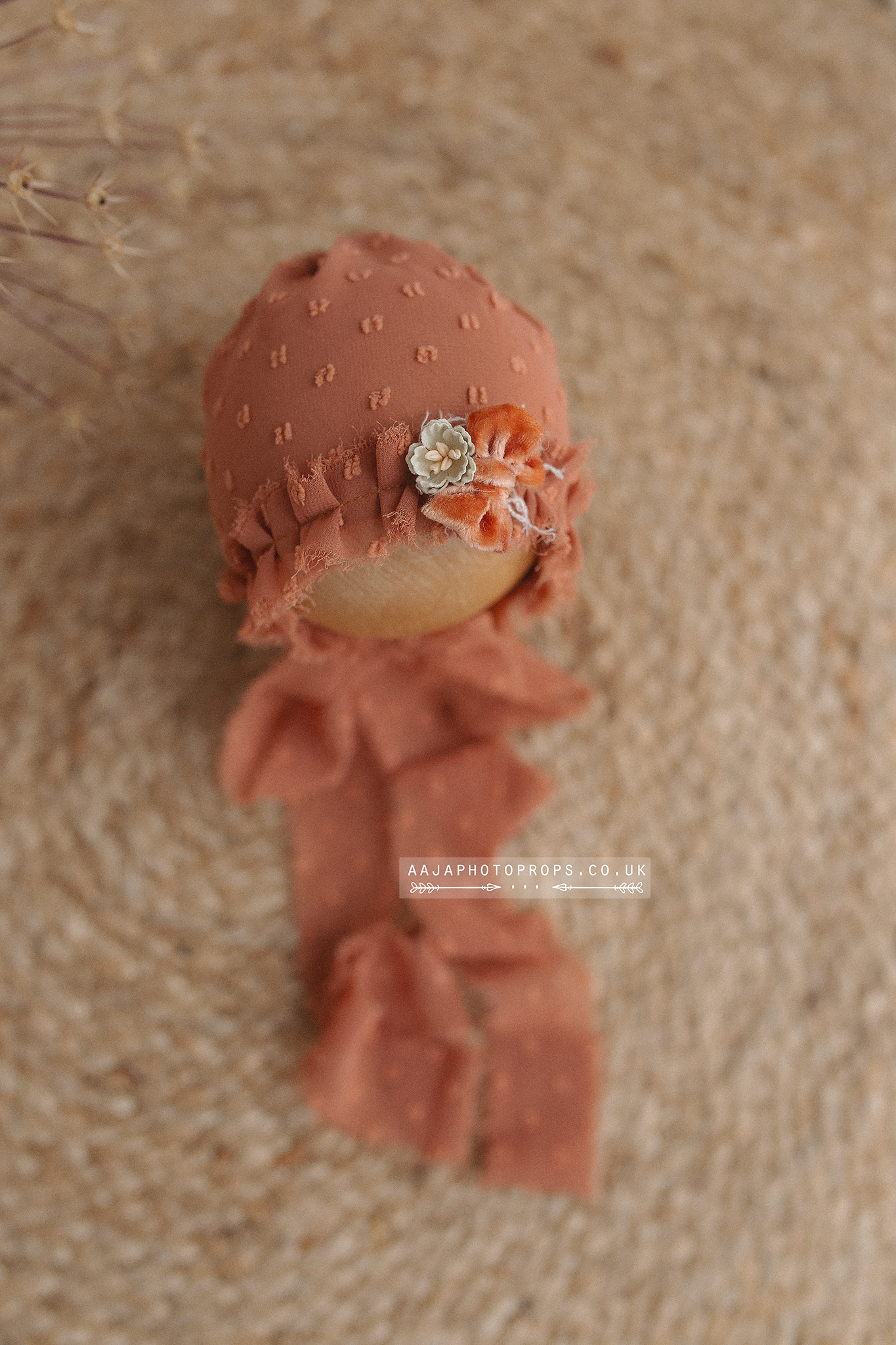 Baby girl newborn bonnet, pastel rust orange, boho, RTS