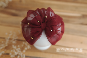 Baby turban hat, dark red, maroon, 9-12 months size, gold, bow, RTS
