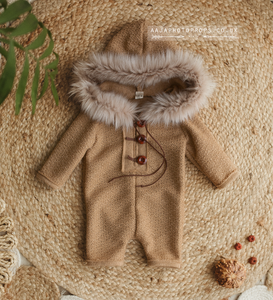 6-9 months sitter romper, beige brown, faux fur, hooded, eskimo, RTS