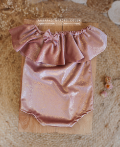 Baby 9-12 months size girl velvet romper, frilly, dusty pink, gold metallic shine, RTS