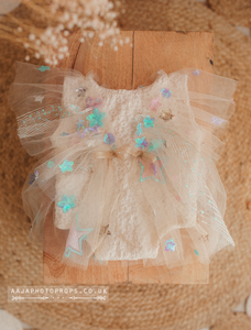 Newborn baby girl romper, vintage, beige boho, frilly, stars, RTS