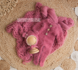 Baby newborn knitted romper, bear bonnet, wrap, layer, berry pink, made to order