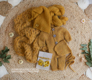 Knitted chunky layer, wrap, hats, velvet bows, romper bundle, mustard yellow, RTS