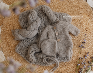 Baby newborn knitted romper, bonnet, wrap, layer, natural, taupe grey, made to order