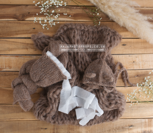 Chunky layer, wrap and 2 bonnets set, soft, brown, made to order