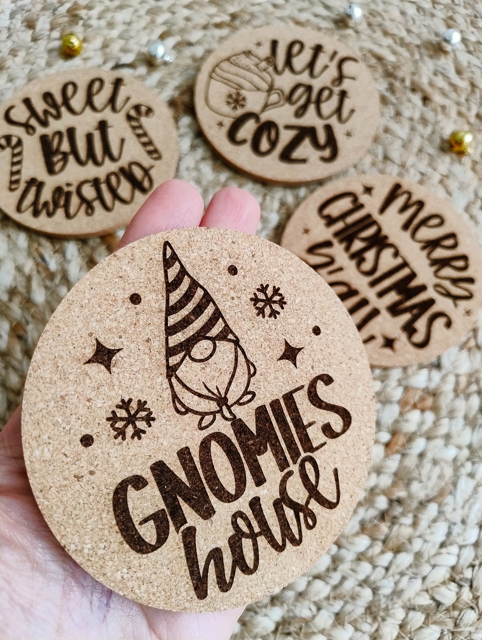 Coffee/tea coasters, cork, engraved, Christmas, Set of 4, RTS