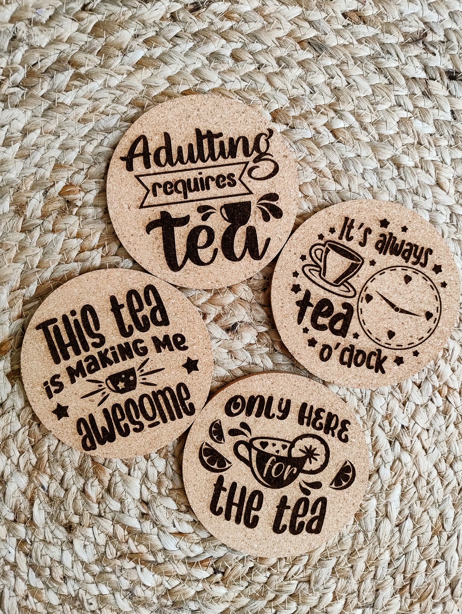 Coffee/tea coasters, cork, engraved, Set of 4, RTS