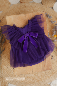 Newborn baby girl romper, vintage, purple, frilly, velvet bow, RTS