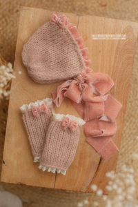 Baby newborn bonnet leg warmers set, pale salmon pink, lace, velvet, RTS
