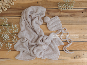 Baby newborn Knitted bonnet and wrap, light beige, made to order