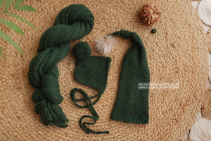 Newborn baby knitted Long wrap, hat, bonnet set, dark green, Made to order
