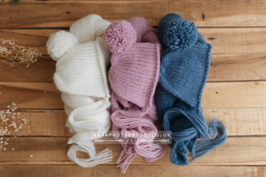 Knitted stretch wrap and pom pom bonnet set, off white, pink, blue, made to order
