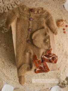 Baby newborn knitted pyjama romper and bonnet, caramel brown, RTS