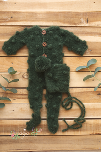 Baby newborn footed romper, bonnet set, bobble, pyjama, pom pom, green, made to order