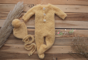 Baby newborn knitted footed romper and hat, soft yellow, pom pom, Made to order