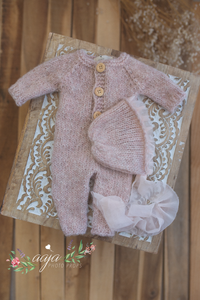 Baby newborn knitted romper and bonnet, pastel blush pink, made to order