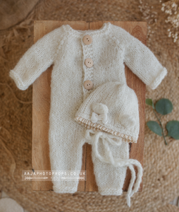 Baby newborn knitted romper and bear bonnet, Cream off white, Made to order