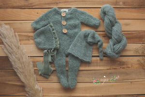 Baby newborn knitted footed romper, hats, wrap, sage teal green, velvet, made to order