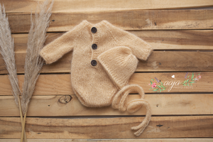 Baby newborn knitted romper and bonnet set, kid silk, pastel yellow, vanilla, made to order