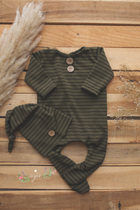 Baby Newborn pyjama romper and hat set, stripe, black, Green, buttons, footed, Made to order