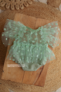 Newborn baby girl romper, polka dot, mint green, boho, frilly, RTS