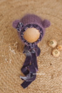 Mauve baby newborn bear bonnet, With velvet ties and bow, made to order