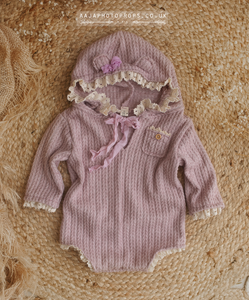 Vintage style hooded bear romper, 9-12 months size, pink, lilac, lace, boho, made to order