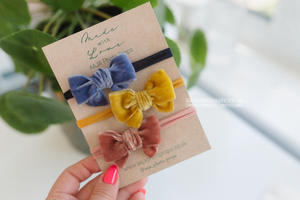 Baby girl small velvet bows tiebacks set, blue, pink, mustard yellow, RTS
